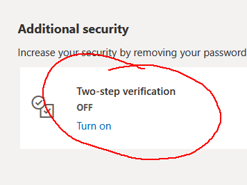 Ainda nessa página, lá em Additional security, vá no Two-step verification e clique em Turn on: